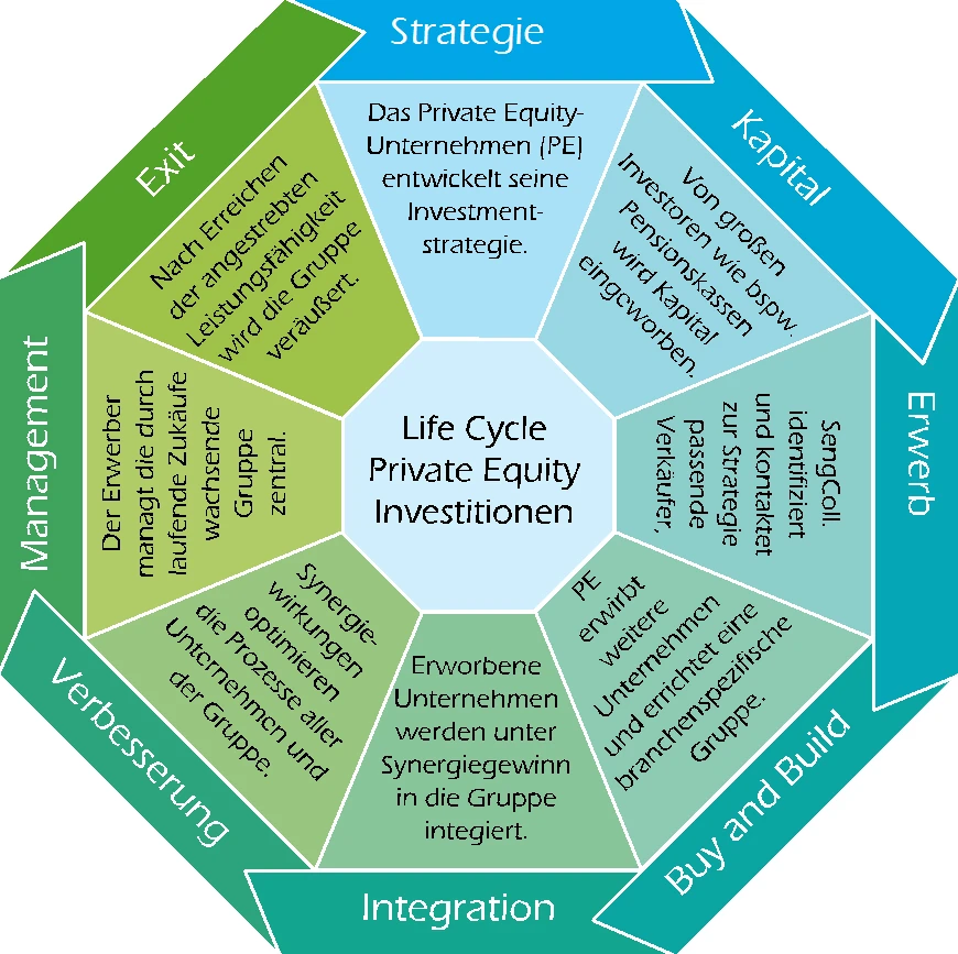 Private Equity verfolgt meist eine buy-and-build Strategie, d.h. man kauft eine größere Zahl von Unternehmen einer ausgewählten Branche und entwickelt diese mit Blick auf ein definiertes Exit-Ziel zu einer möglichst dominanten Gruppe. Auf Kontinuität in der Unternehmensführung wird besonderer Wert gelegt. Dem Verkäufer bietet man attraktive Möglichkeiten der Rückbeteiligung, die ihn vom erzielten Gewinnwachstum profitieren lassen. Beim späteren Verkauf der Rückbeteiligung wird für deren Bewertung der erzielte höhere Gewinn zugrunde gelegt, was den gesamten Veräußerungserlös beträchtlich erhöhen kann.